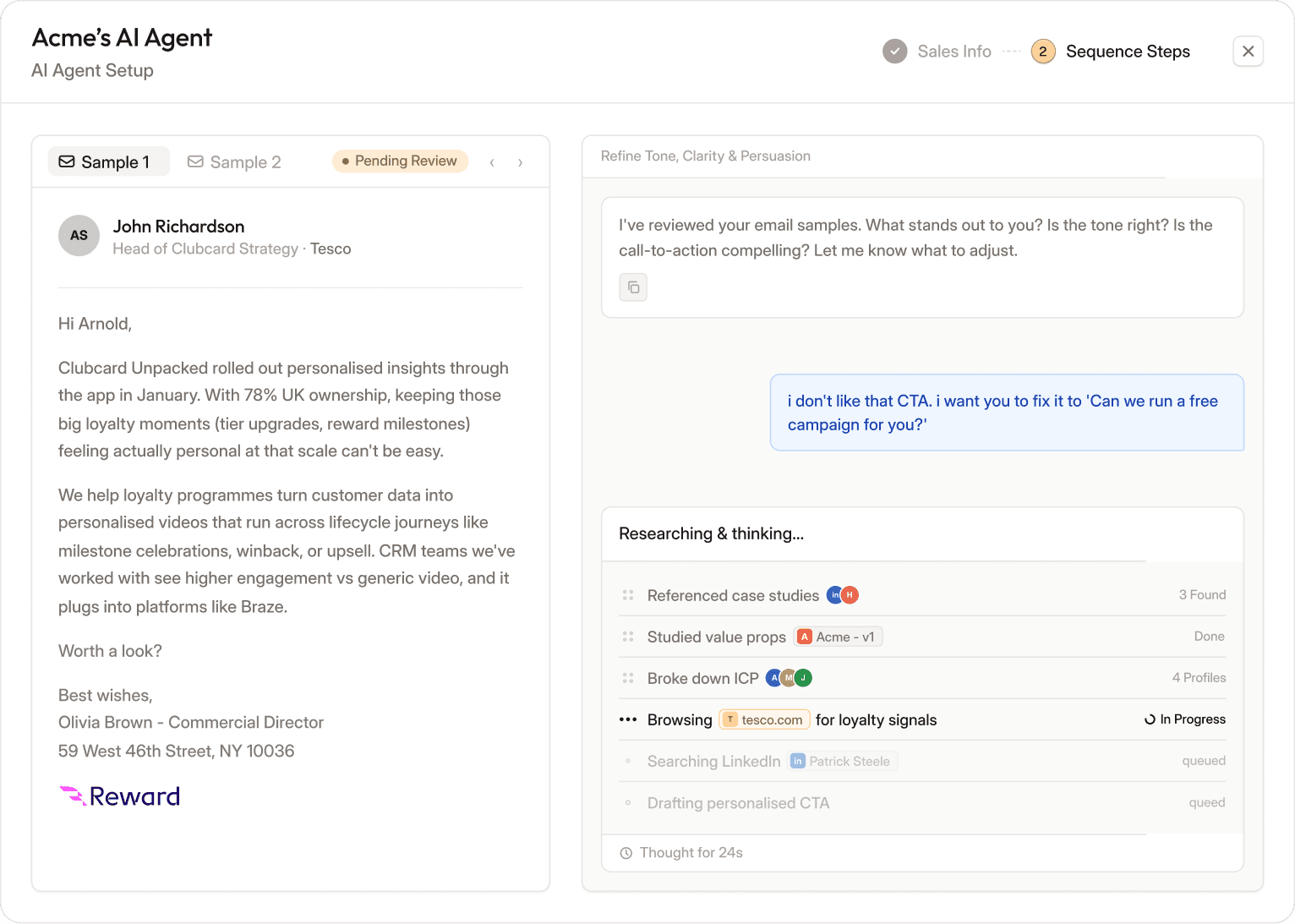 Your tone and value props become the foundation for every message. The output reads like your best rep wrote it for that specific prospect.