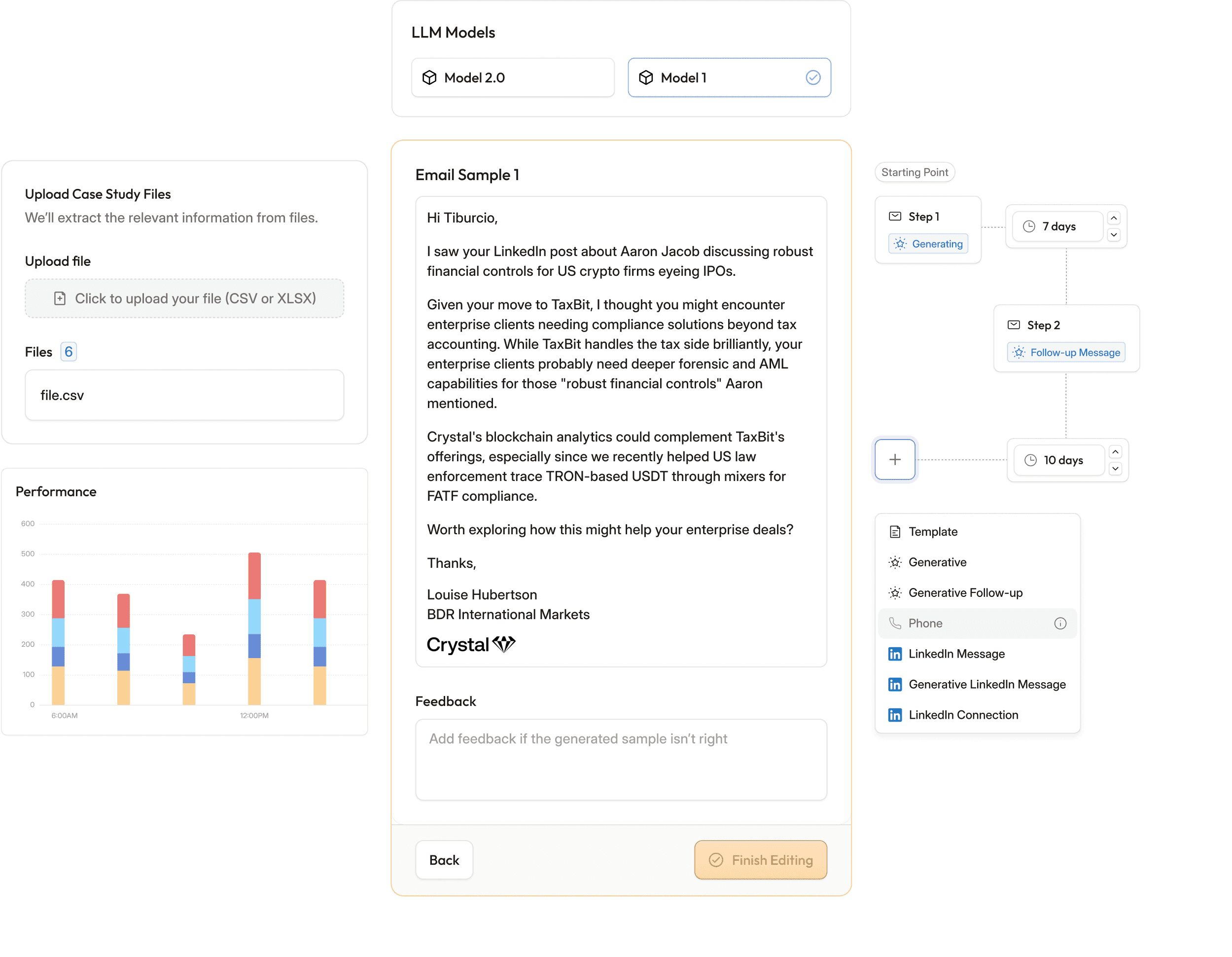Add tone of voice, ICP definitions, case studies, deal history, and any custom scraping rules so the model writes like your team.