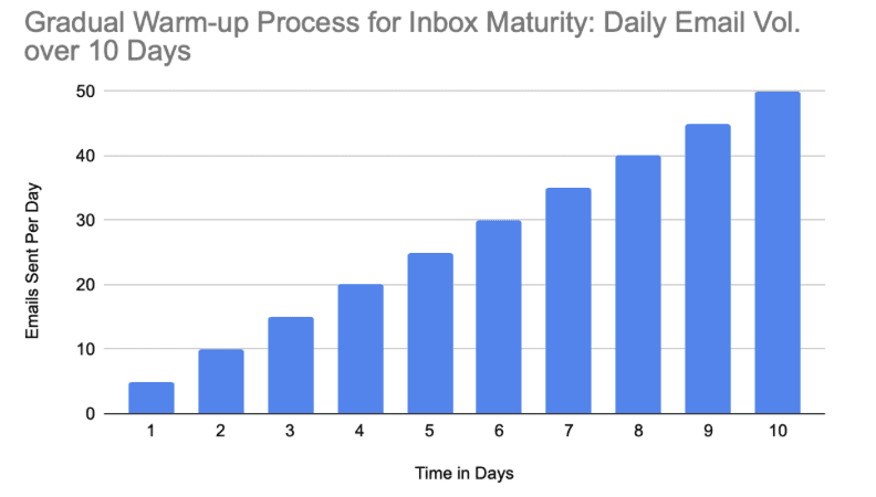 Plan: start with 5 emails on Day 1 and increase by 5 emails per day until you reach 50/day by Day 10.