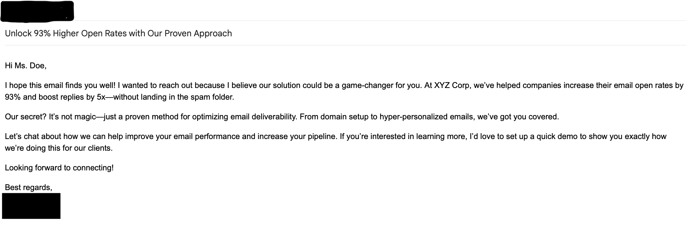 Hyper-personalisation is the name of the game. Spam filters aren't dumb—they can sniff out patterns faster than you can say "cookie-cutter." So, if you're sending the same basic emails to hundreds of prospects with only a few words tweaked, you're asking for trouble. Just look at the example below