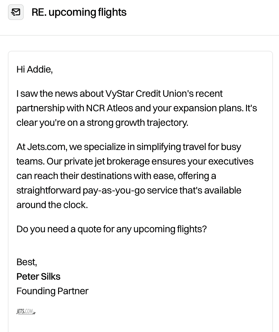 But when you switch gears and focus on hyper-personalised emails, you're creating connections that feel genuine and tailored. For instance, look at the example below: