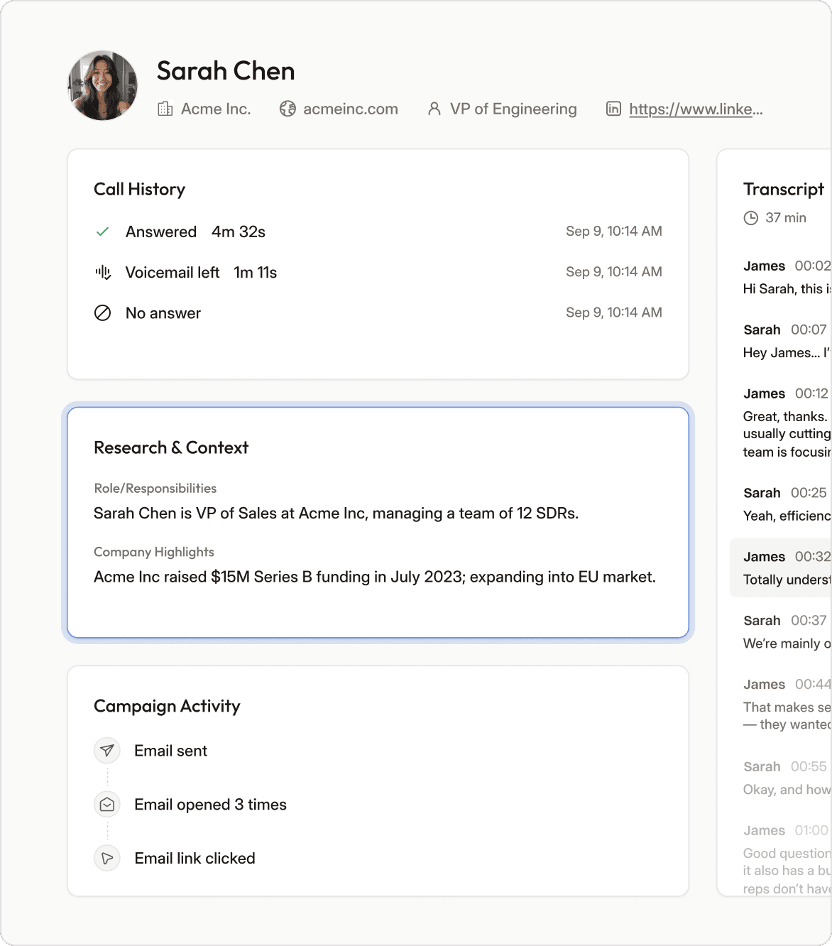 Perlon gathers public company data, funding rounds, and role information before each call. Reps sound informed, credible, and personal with every conversation.