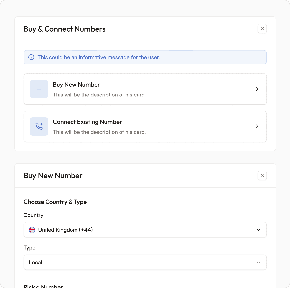 Set up your calling infrastructure in minutes. Purchase or connect local and international numbers directly in the platform, ready to assign to reps instantly. No third-party tools or complex setup required.