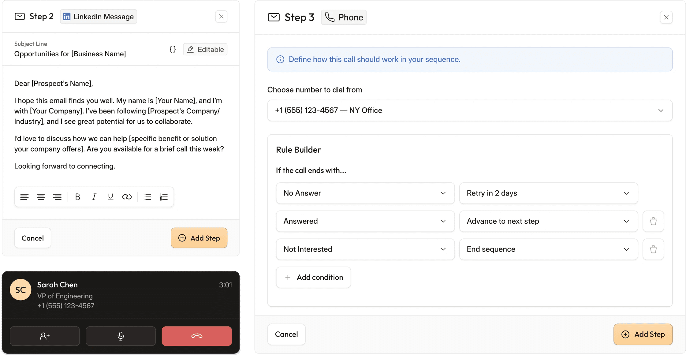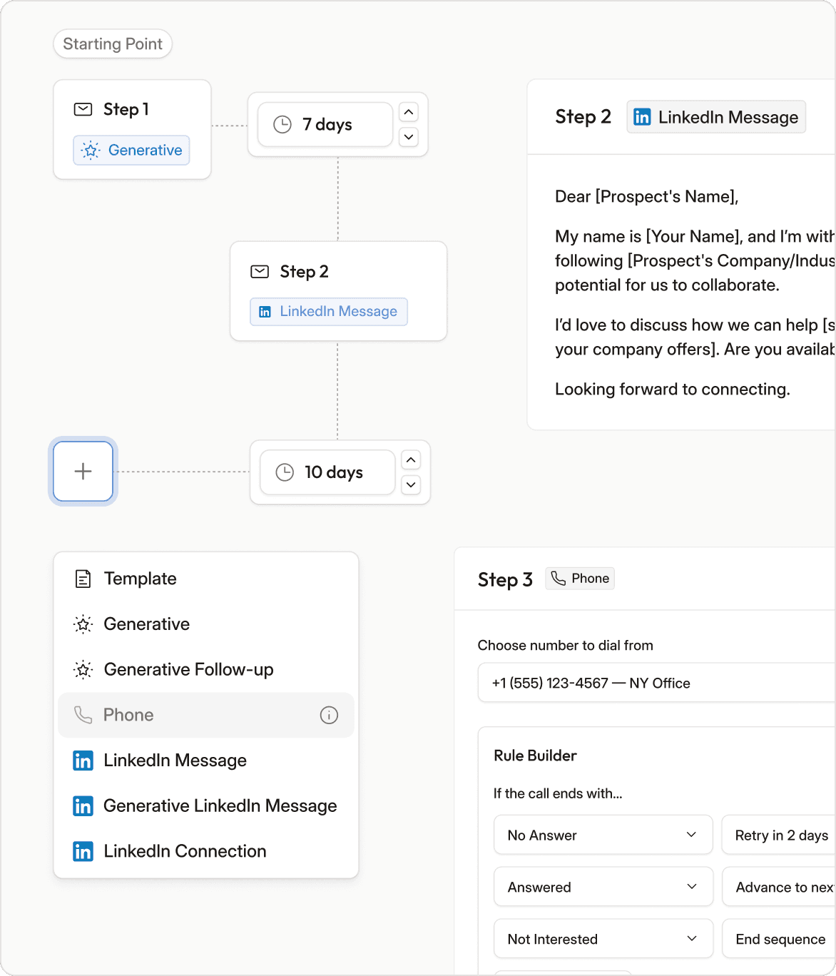 Perlon replaces siloed tools with a single campaign builder. Create sequences that mix email, phone and LinkedIn steps so every touchpoint works together.