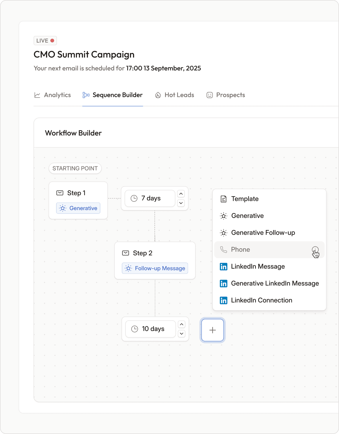 Combine email, LinkedIn, phone, and voice in a single flow.